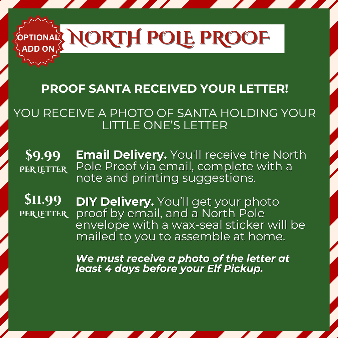 DIY – $11.99: Receive your photo proof via email along with print instructions. An official North Pole envelope and wax-seal sticker will be delivered to you via mail, ready for you to assemble the letter and photo and create your own special delivery from the North Pole.